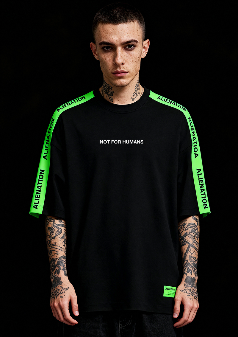 Bande fluo sulle maniche e il logo Alienation® olografico sul retro, questa t-shirt è sicuramente diversa da tutte le altre. Sono poi inseriti vari dettagli come la stampa sul fronte "not for humans" e la targhetta frontale fluo.