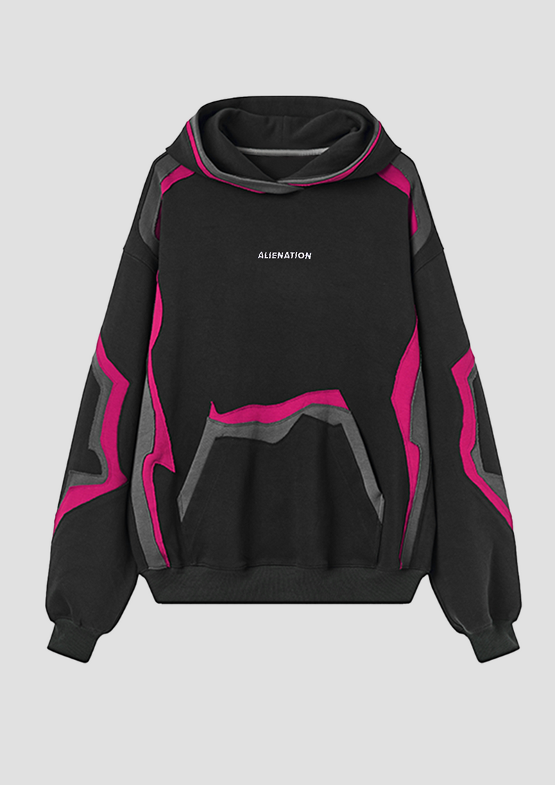 Design Avanguardista Immergiti in una visione futuristica con la nostra felpa nera, impreziosita da layer asimmetrici  nei toni vivaci del grigio e del fucsia. Questi inserti sono posizionati strategicamente per creare un effetto visivo dinamico e originale.
