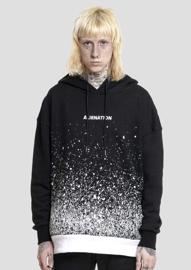 DESCRIZIONE: Felpa oversize nera con stampa pattern "schizzi di vernice" sul fondo con elastico nello stesso colore. Completa il prodotto la stampa del logo Alienation® sul petto.