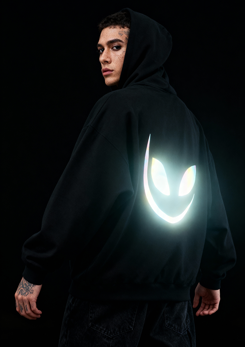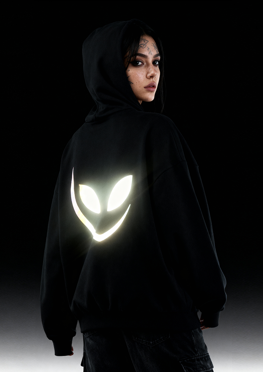 Di base una felpa nera normale. Poi una luce diretta la colpisce(flash, fari ecc). Boom, l'alieno si illumina.