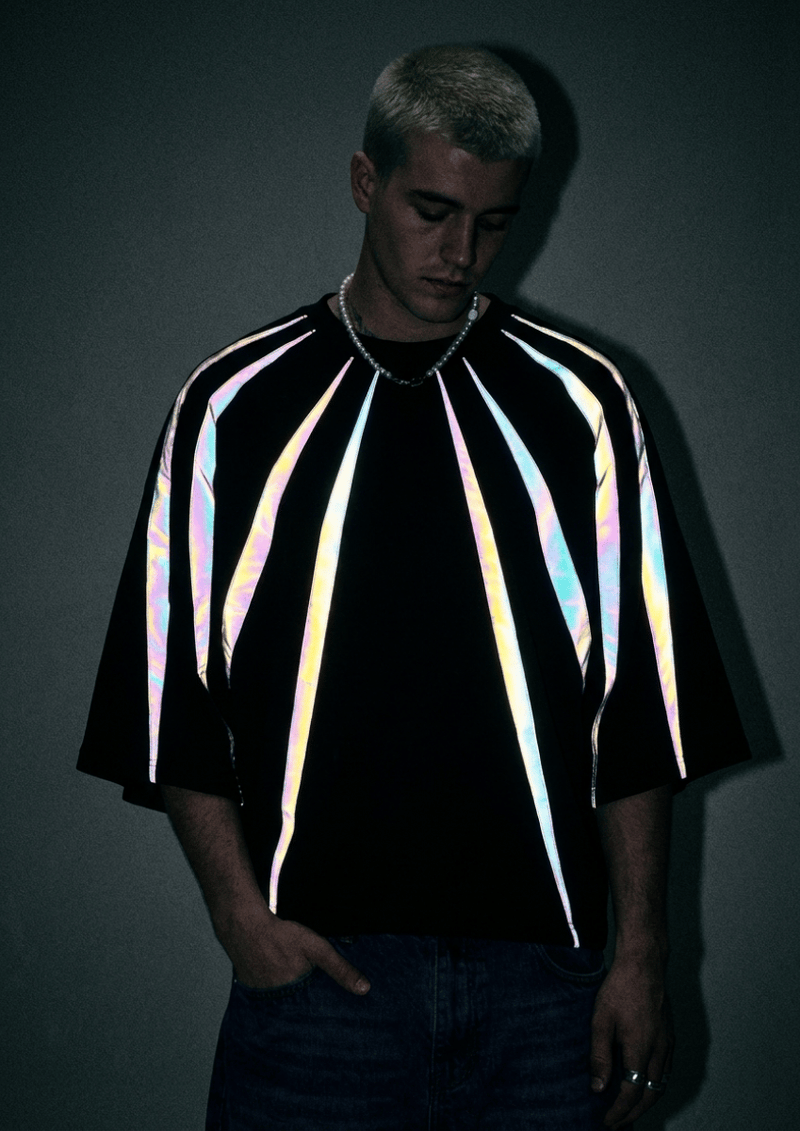 Di base una t-shirt nera normale. Poi una luce diretta li colpisce(flash, fari ecc). Boom, la t-shirt si illumina.