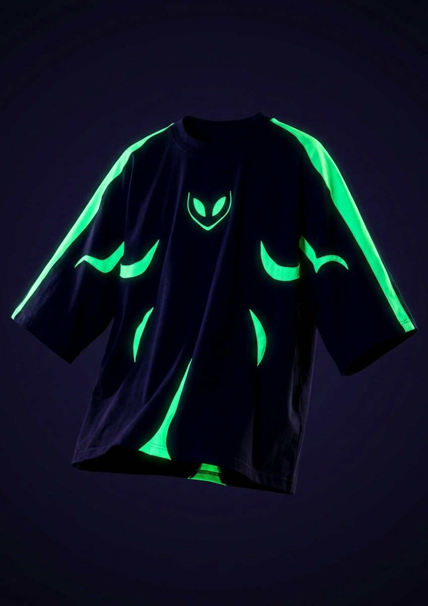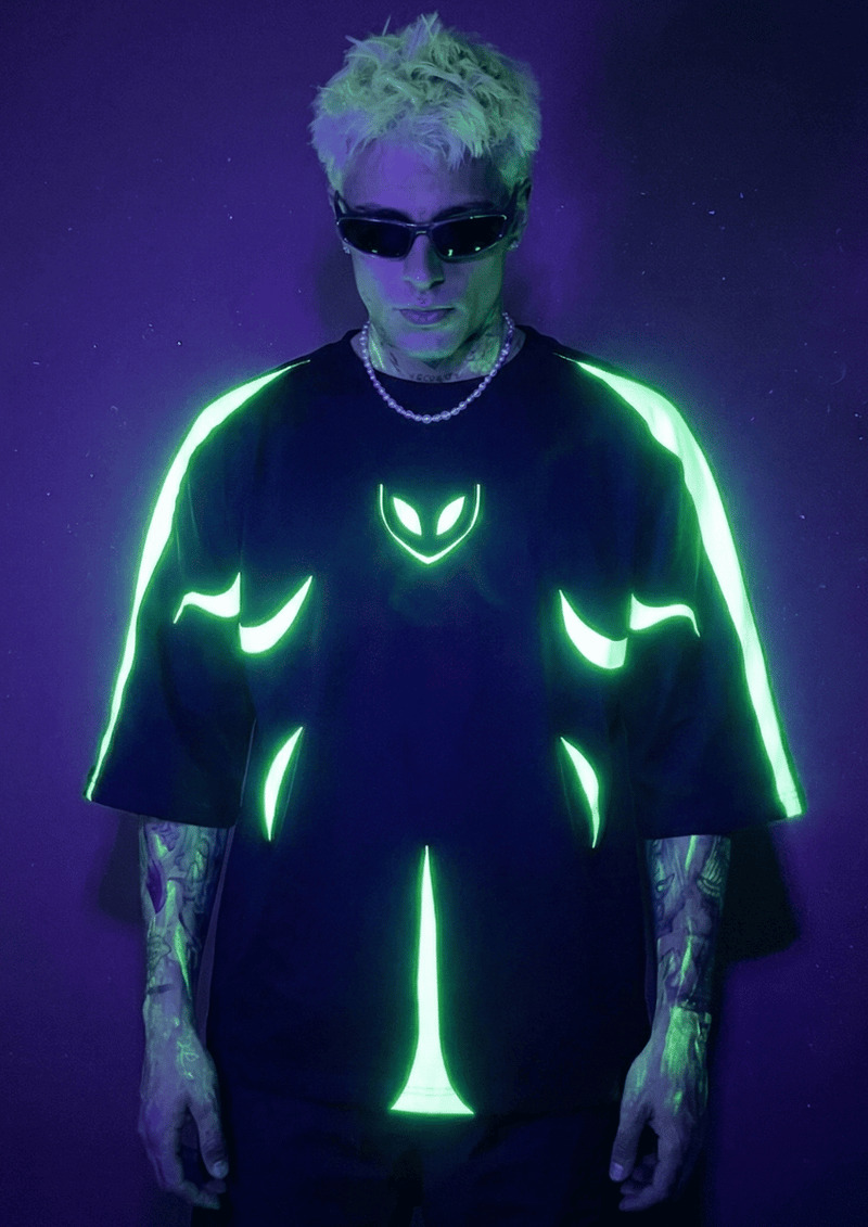 Di base una t-shirt nera normale. Poi sotto luce ultravioletta (luci dei club), la t-shirt si illumina splendendo con dettagli verdi fluo.