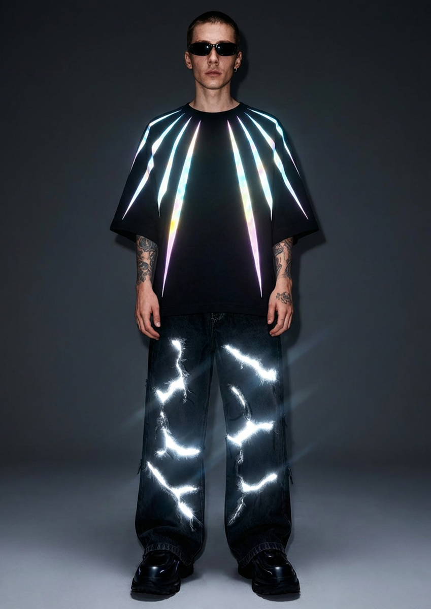 T-shirt oversize nera con strisce riflettenti che si irradiano dal collo creando un effetto starburst, abbinata a jeans baggy con fulmini luminosi. Total black con dettagli reflective ad alto impatto, silhouette voluminosa e rilassata.