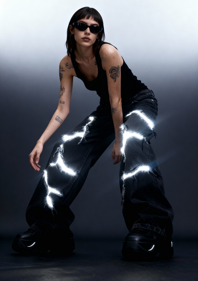 T-shirt bianca oversize con strisce riflettenti iridescenti a raggiera, abbinata a denim pants neri con fulmini luminosi. Contrasto cromatico netto tra top clean e pants elettrici, dettagli holographic sul bianco che virano dal silver al rainbow.