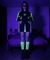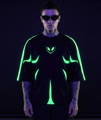 Di base una t-shirt nera normale. Poi sotto luce ultravioletta (luci dei club), la t-shirt si illumina splendendo con dettagli verdi fluo.
