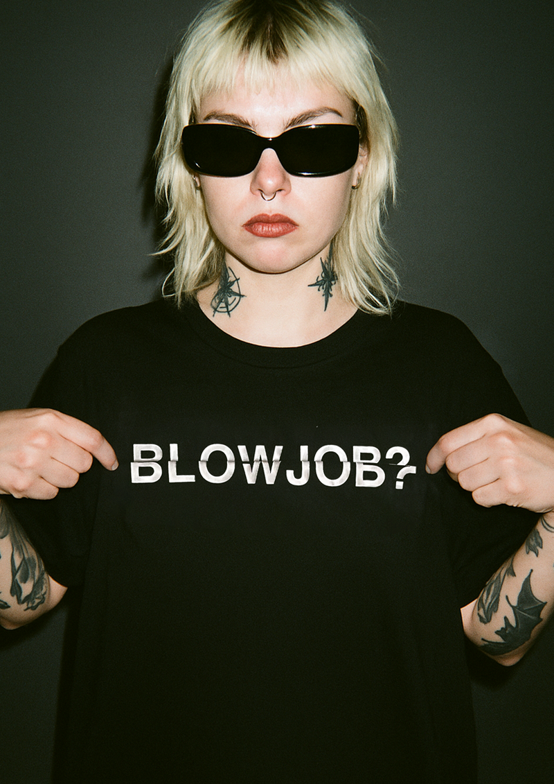 Ha una stampa che sembra solo un design a caso, ma c'è un twist: piegala e bam, appare la scritta "BlowJob".